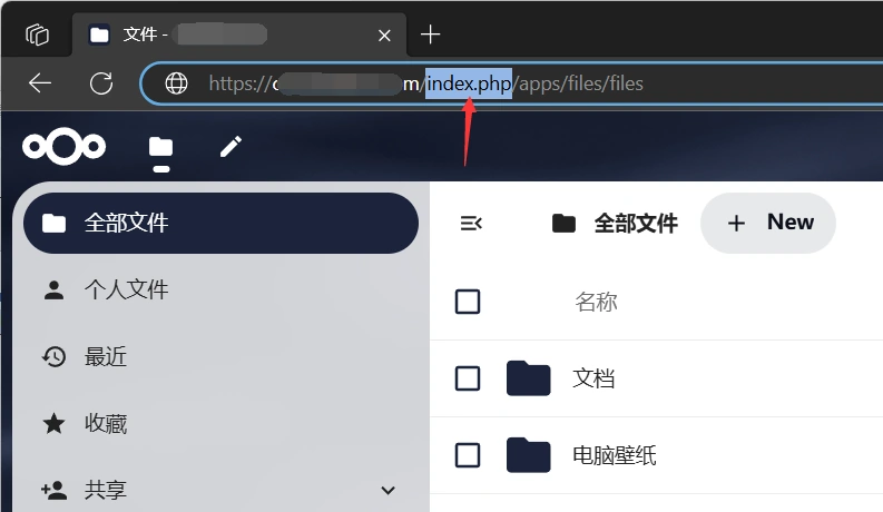 搭建Nextcloud云同步项目,项目域名URL中有“index.php”字符,影响URL的美观,从用户体验的角度来看,一个简洁、没有多余字符的URL会显得更专业、更直观。
