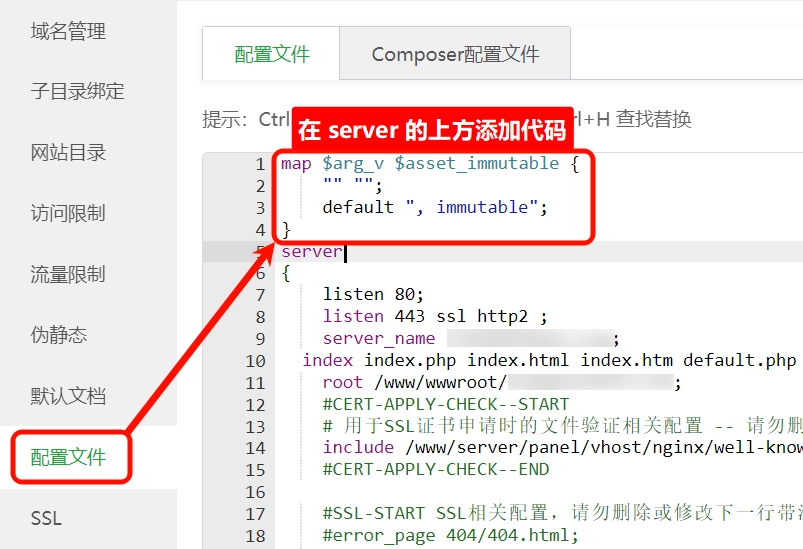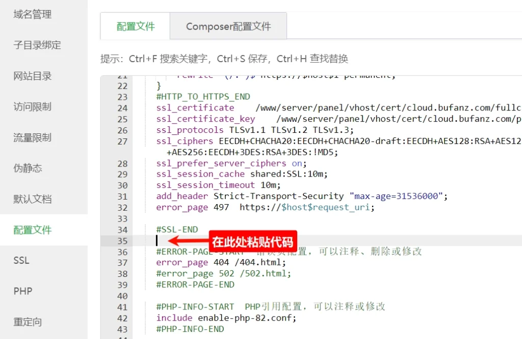 二. 往下翻找到`#SSL-END`,在其下方粘贴以下代码。