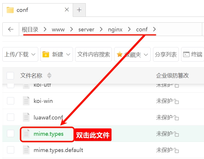 四. 按照下图的步骤,在文件管理找到`/www/server/nginx/conf`目录,双击打开`mime.types`文件。